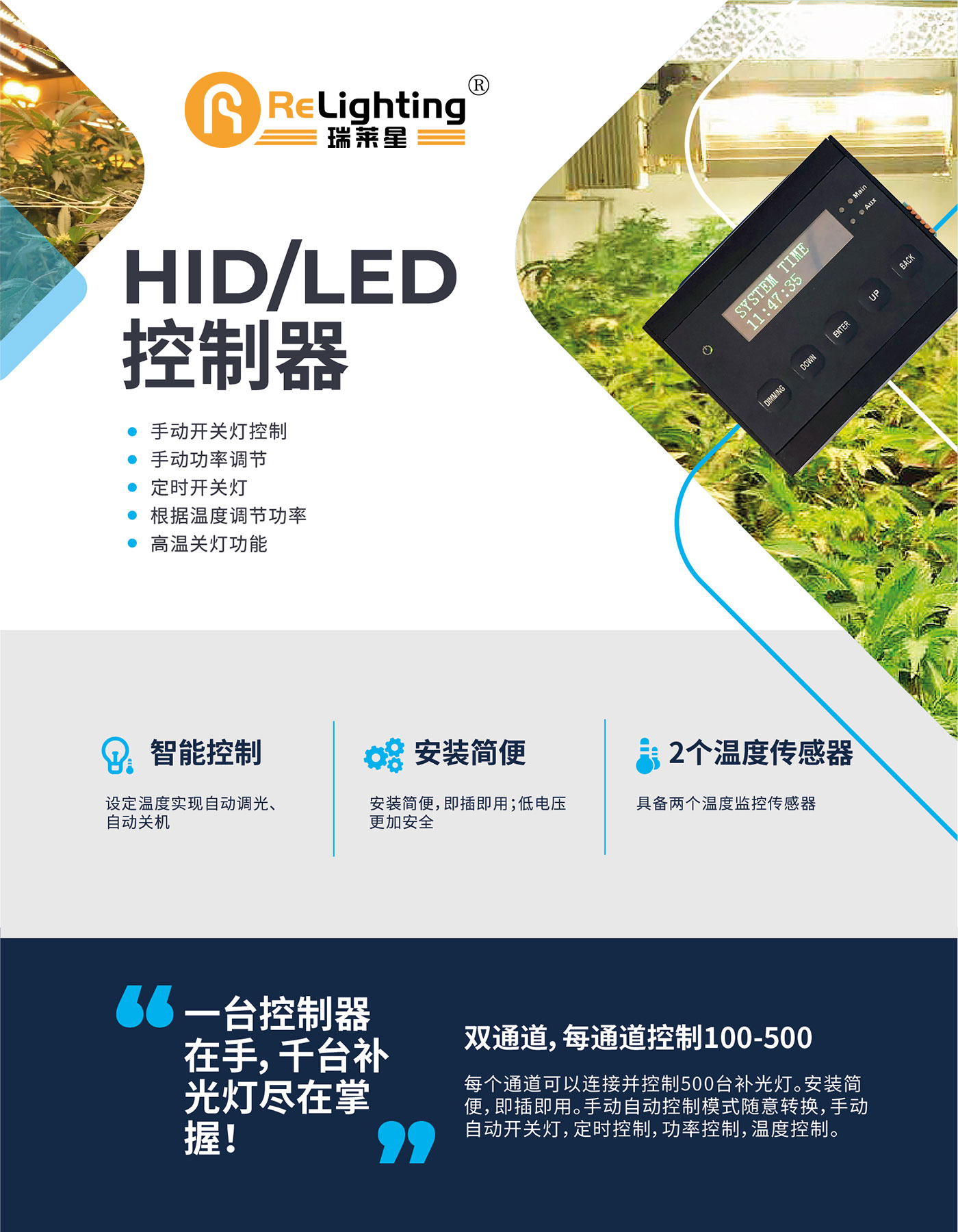 ● 手動(dòng)開(kāi)關(guān)燈控制 ● 手動(dòng)功率調(diào)節(jié) ● 定時(shí)開(kāi)關(guān)燈 ● 根據(jù)溫度調(diào)節(jié)功率 ● 高溫關(guān)燈功能